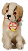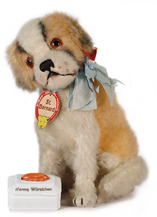 ST. BERNARD Hund, sitzend, Artikel-Nr. 3517, hergestellt am 21.05.1930, mit Knopf, Druckbuchstaben, langgezogenes f, unbespielte rote Fahne, Nr. auf der Fahne: 3517, rote Aufschrift: St. Bernard, Wollplüsch, drehbarer Kopf, H: 18 cm, Handmuster aus dem Steiff-Archiv mit orig. Steiff-Archiv Anhänger