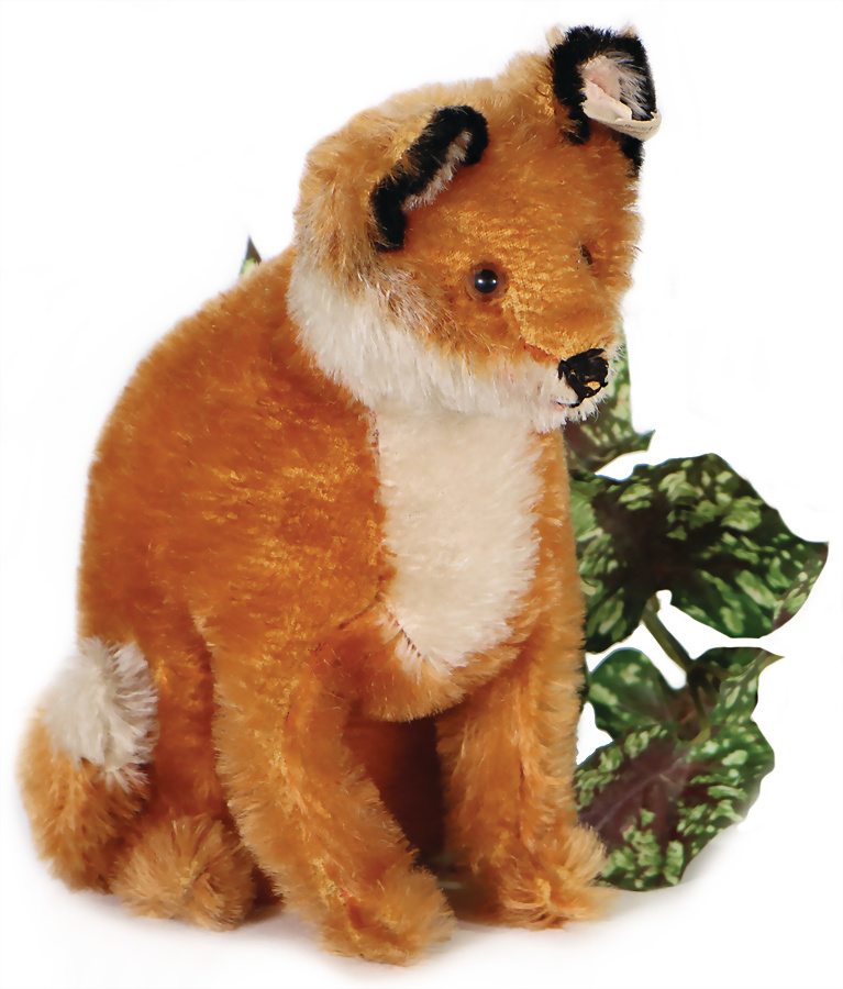 Fuchs, Artikel-Nr. 3317, hergestellt 1924, mit Knopf, Druckbuchstaben, langgezogenes f, weiße Papier-Fahne, Nr. auf Fahne: 3317, Glasaugen, sitzend, rostrotes Mohair, H: 18 cm, sehr schöner Zust., Handmuster aus dem Steiff-Archiv mit orig. Steiff-Archiv Anhänger