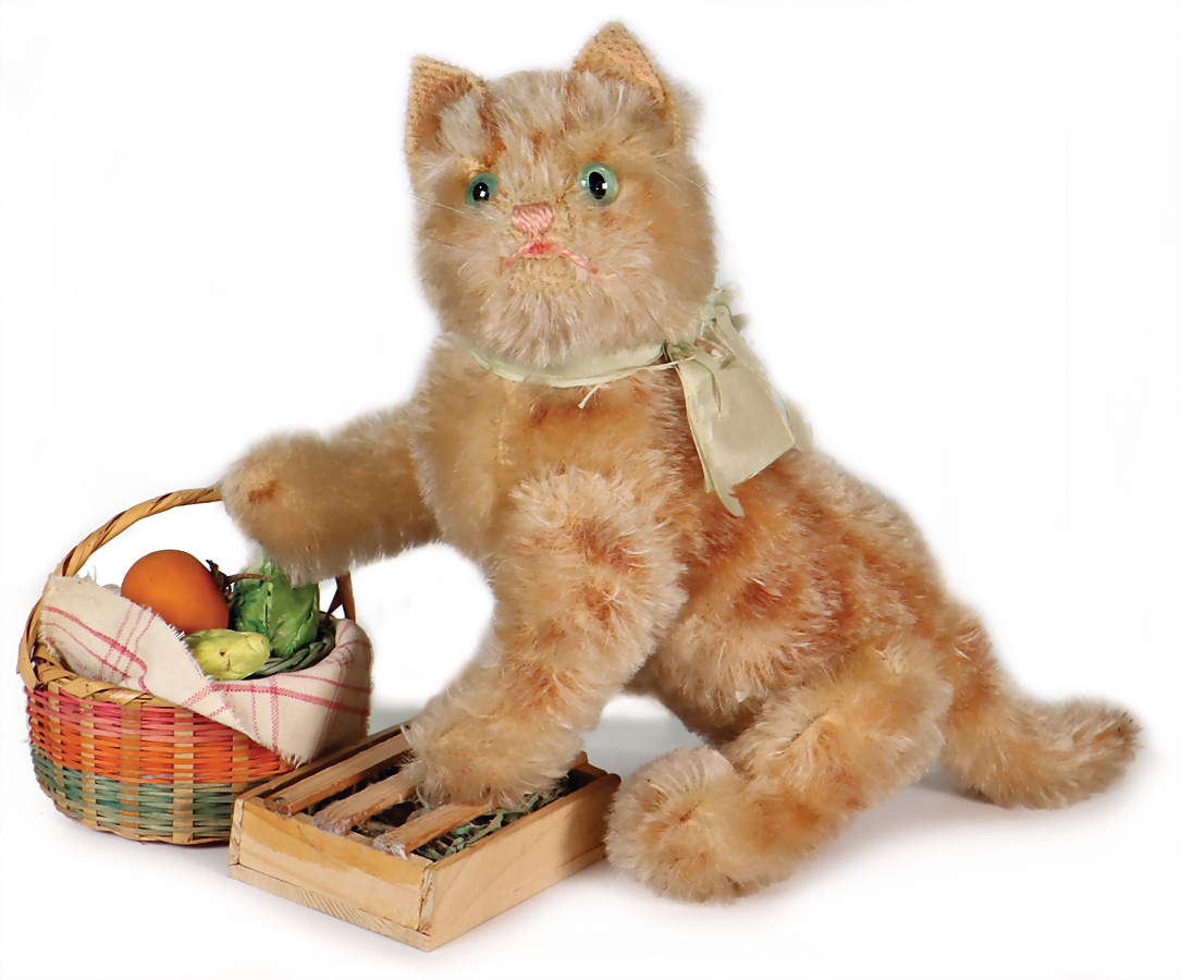 Katze, Artikel-Nr. 5314, hergestellt am 16.08.1929, 5-fach gegliedert, grüne Glasaugen, rostrotes gestromeltes Mohair, sehr schöner Zust., Handmuster aus dem Steiff-Archiv mit orig. Steiff-Archiv Anhänger