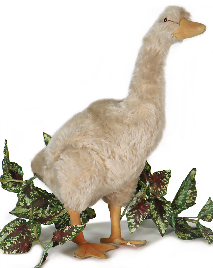 Gans, Artikel-Nr. 5328, hergestellt 1911, mit Knopf, Druckbuchstaben, langgezogenem f, weiße Papierfahne, Nr. 5328, stehend mit beweglichen Beinen, filzunterlegte Schuhknopfaugen, Filzschnabel sowie Filzfüße, an kleinen Stellen Füße etwas offen, 36 cm, beiges Mohair in sehr schönem Zustand, Handmuster aus dem STEIFF Archiv, mit original STEIFF Archiv-Plakette