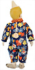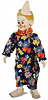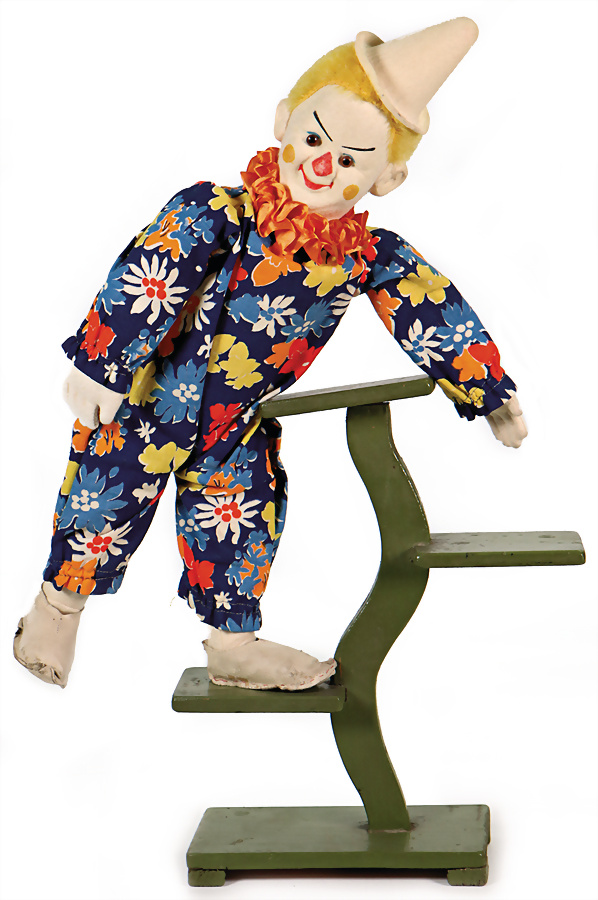 Clown, Artikel-Nr. 35, hergestellt 1936, Filz-Kopf, aufgesetzte Papiermaché Ohren, aufgesetzte Glasaugen, stark ausmodell. Nase, sowie Bäckchen und Doppelkinn, deutl. aufgemaltes Airbrush, Filz-Hut, eingesetzte gelbe Mohair Haare, lose angenähte Arme, Filz-Hände, Filz-Körper mit Quitsch-Stimme, geblümter Anzug mit orangefarbener Halskrause, 40 cm, minim. Farbabrieb an der Nasenspitze sonst sehr schöner unbespielter Zust., Handmuster aus dem Steiff-Archiv mit orig. Steiff-Archiv Anhänger