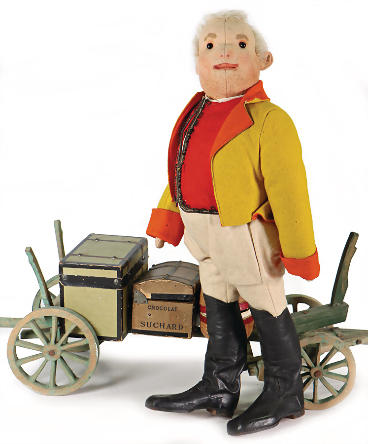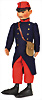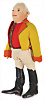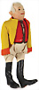 Filz-Puppe POSTILLON, Artikel-Nr. 43 cm, hergestellt 1914, mit kl. Steiff-Knopf, Druckbuchstaben, langgezogenes f, Schuhknopfaugen, eingesetzte Mohair Haare, durch Airbrush angedeuteter 3 Tage Bart, minim. Filz-Fehler an der linken Schläfe, sowie an der roten Weste, Absatz-Stiefel, 43 cm, selten, ausdrucksstark, Handmuster aus dem Steiff-Archiv mit orig. Steiff-Archiv Anhänger