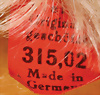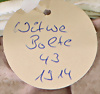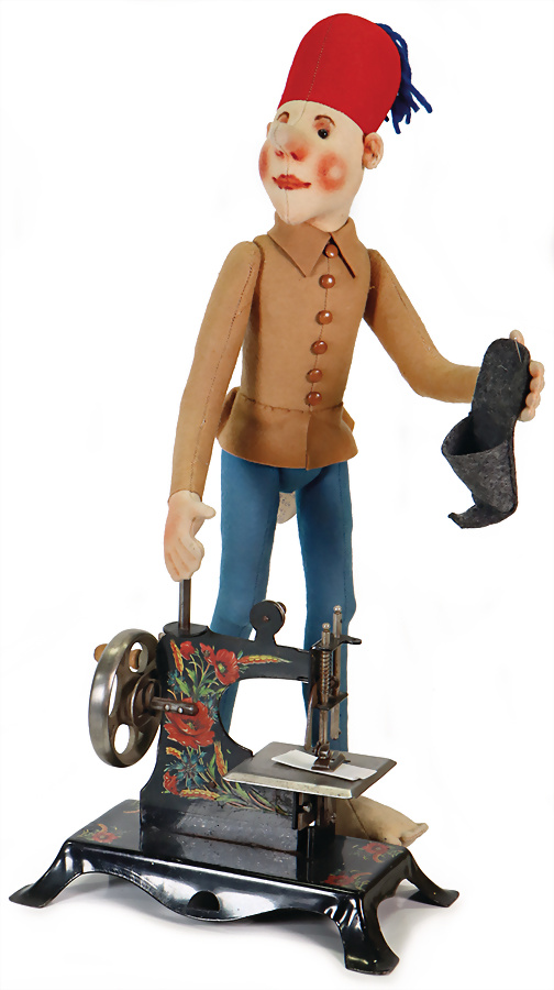 Filz-Figur SCHNEIDER BÖCK, Märchenfigur aus dem Kinderbuch „Max und Moritz“, Artikel-Nr. 43, hergestellt 1914, mit Knopf, Druckbuchstaben, langgezogenes f, Reste der weißen Fahne, Schuhknopfaugen, absolut deutl. Airbrush Bemalung, lange ausmodell. Nase, hoher roter Hut mit blauer Wollquaste, Filz-Kleidung, nur mit einem Schuh bekleidet, überlange Arme und Beine, 43 cm, vereinzelt kl. Filz-Fehler an der Rückseite des linken Beins, sowie kl. verfärbte Stelle an der Ferse, sonst sehr schöner unbespielter Zust., Handmuster aus dem Steiff-Archiv mit orig. Steiff-Archiv Anhänger