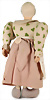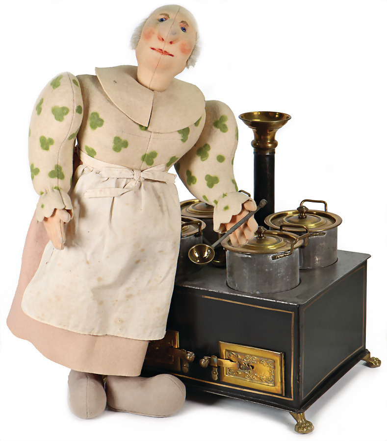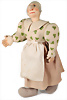 Filz-Figur WITWE BOLTE, Märchenfigur aus dem Kinderbuch „Max und Moritz“, Artikel-Nr. 43, hergestellt 1914, Filz-Kopf, mit kl. Käppchen, eingesetztes graues Mohair, blaue Glasaugen, stark ausmodell. Nase, Filz-Kragen, geblümte Filz-Kleidung, Leinen-Schürze, Filz-Rock an einer Seite mit Filz-Schäden, sowie kl. Filz-Schäden an den Füßen, sonst sehr schöner orig.-Zust., 41 cm, Handmuster aus dem Steiff-Archiv mit orig. Steiff-Archiv Anhänger
