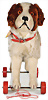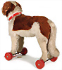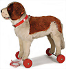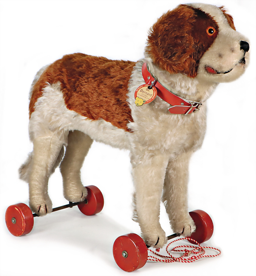 Hund, BERNHARDINER-BERN, Artikel-Nr. 1335, hergestellt Oktober 1932, mit Knopf, Druckbuchstaben, langgezogenes f, unbespielte rote Fahne, Nr. auf Fahne: 1335b, Glasaugen, sehr schönes volles Mohair, auf roten Holz-Rollen, orig. Leder-Halsband, Zugleine, Stehhöhe: 38 cm, L: 39 cm, Handmuster aus dem Steiff-Archiv mit orig. Steiff-Archiv Anhänger