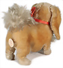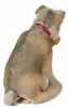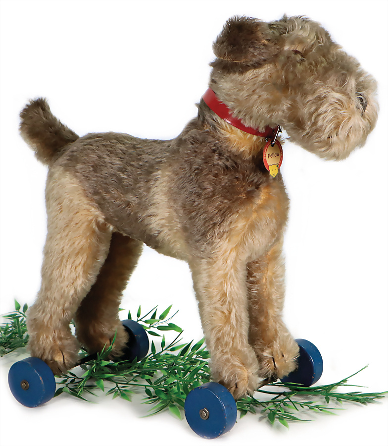Hund FELLOW, Artikel-Nr. 1335, hergestellt am 08.07.1936, mit Knopf, Druckbuchstaben, langgezogenes f, unbespielte gelbe Fahne, Nr. auf Fahne: 1335, orig. Leder-Halsband, mit Brustschild mit roter Aufschrift: Fellow, Glasaugen, grau/braunes volles Mohair, sehr schöner Zust., H: 38 cm, L: 40 cm, Handmuster aus dem Steiff-Archiv mit orig. Steiff-Archiv Anhänger