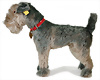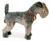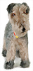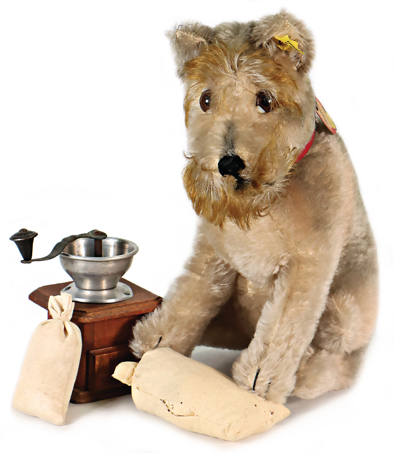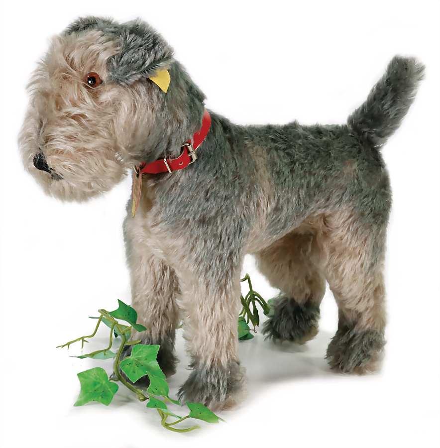 IRISH BLUE TERRIER, Artikel-Nr. 1328,02, hergestellt am 03.04.1941, mit Knopf, Druckbuchstaben, langgezogenes f, unbespielte gelbe Fahne, Aufschrift: Steiff Original geschützt 1328,02, made in Germany, Brustschild mit roter Aufschrift: Irish Blue Terrier, stehend, sehr schönes blaugraues Mohair, H: 29 cm, L: 34 cm, unbespielter orig.-Zust., extrem selten, Handmuster aus dem Steiff-Archiv mit orig. Steiff-Archiv Anhänger