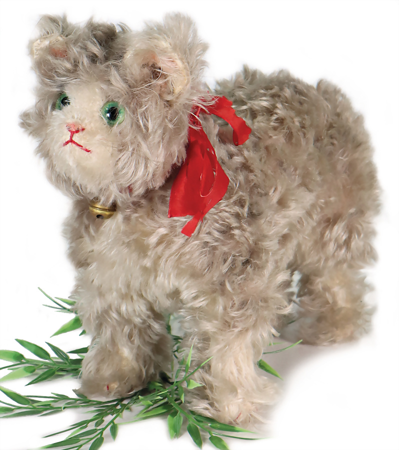 Katze, Artikel-Nr. 1326,01, hergestellt am 17.08.1926, Katze auf 4 Pfoten, grüne Glasaugen, Langmohair, Druckstimme nicht intakt, rote Seidenschleife altersbed. etwas verschlissen, sehr schöner orig.-Zust., H: 26 cm, L. mit Schwanz: 45 cm, Handmuster aus dem Steiff-Archiv mit orig. Steiff-Archiv Anhänger