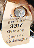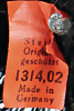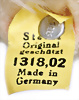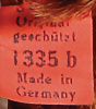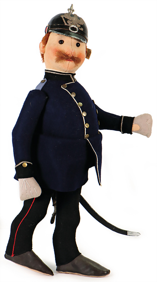 Filz-Figur, Deutscher Polizist, Artikel-Nr. 35, hergestellt 1913, mit kl. Steiff-Knopf, Druckbuchstaben, langgezogenes f, orig. Papier-Fahne, Aufschrift: Steiff Original geschützt Pld35, lederne Pickelhaube, Schuhknopfaugen, brauner Mohair-Einsatz auf dem Kopf, sowie Oberlippenbart, Filz-Kleidung mit zweifacher Knopfreihe, graue Handschuhe, Gürtel mit Säbel, mit Lederstiefeln, unbespielter orig.-Zust., 35 cm, Handmuster aus dem Steiff-Archiv mit orig. Steiff-Archiv Anhänger
