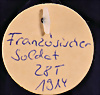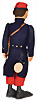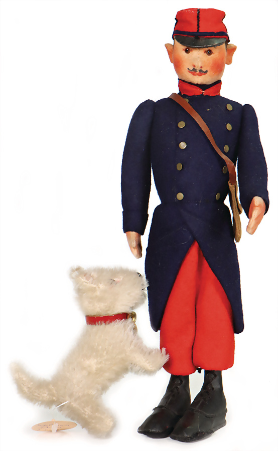 Filz-Figur, französischer Soldat, Artikel-Nr. 82T, hergestellt 1914, mit Knopf, weiße Papier-Fahne, Aufschrift: Steiff Original geschützt sof 28, Filz-Kopf, braune Glasaugen, schönes deutl. Airbrush, gemalter Oberlippenbart, dunkelbraune gemalte Haare, Filz-Uniform mit doppelter Knopfreihe, kl. diagonale Leinentasche, Lederstiefel, unberührter orig.-Zust., 29 cm, Handmuster aus dem Steiff-Archiv mit orig. Steiff-Archiv Anhänger