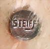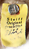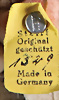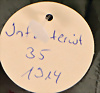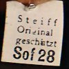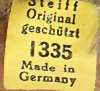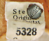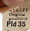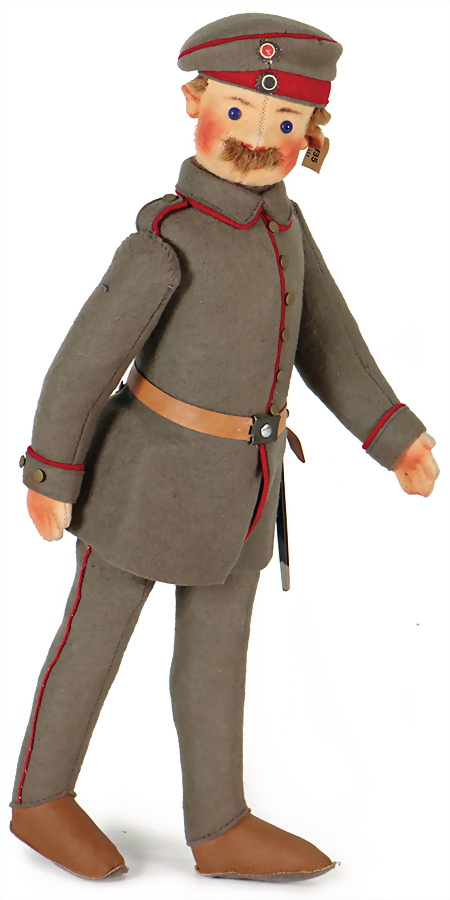 INFANTERIST, Artikel-Nr. 35, hergestellt 1914, mit kl. Knopf, Druckbuchstaben, langgezogenes f, weiße Papier-Fahne, Aufschrift: Inf 35 Steiff, Filz-Kopf, kl. blaue Glasaugen, eingesetzte Mohair-Haare, sowie Oberlippenbart, Filz-Mütze, khakifarbene Filz-Uniform, Knopfreihe, Gürtel mit Säbel, sehr schönes deutl. Airbrush, errötete Wangen und Ohren, 35 cm, unbespielter Zust., Handmuster aus dem Steiff-Archiv mit orig. Steiff-Archiv Anhänger