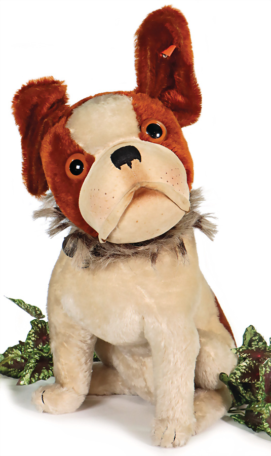 Herausragender BULLY, Artikel-Nr. 3343,02, hergestellt am 12.01.1930, mit Knopf, Druckbuchstaben, langgezogenes f, perfekte rote Fahne mit Aufschrift: Steiff Original geschützt 3343,2 made in Germany, gr. Glasaugen, sitzend, Leder-Halsband mit Halskrause, bespickt mit 4 orig. Steiff-Knöpfen, Brustschild mit Metallring, Aufschrift: Bully 3343,2 Steiff Original, Samt-Schnauze, sehr schönes feines Airbrush, beiges und rostbraunes Mohair, drehbarer Kopf, Biegedraht in den Ohren, Sitzhöhe: 50 cm, ausgefallen, Handmuster aus dem Steiff-Archiv mit orig. Steiff-Archiv Anhänger
