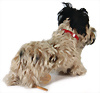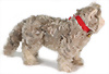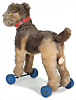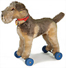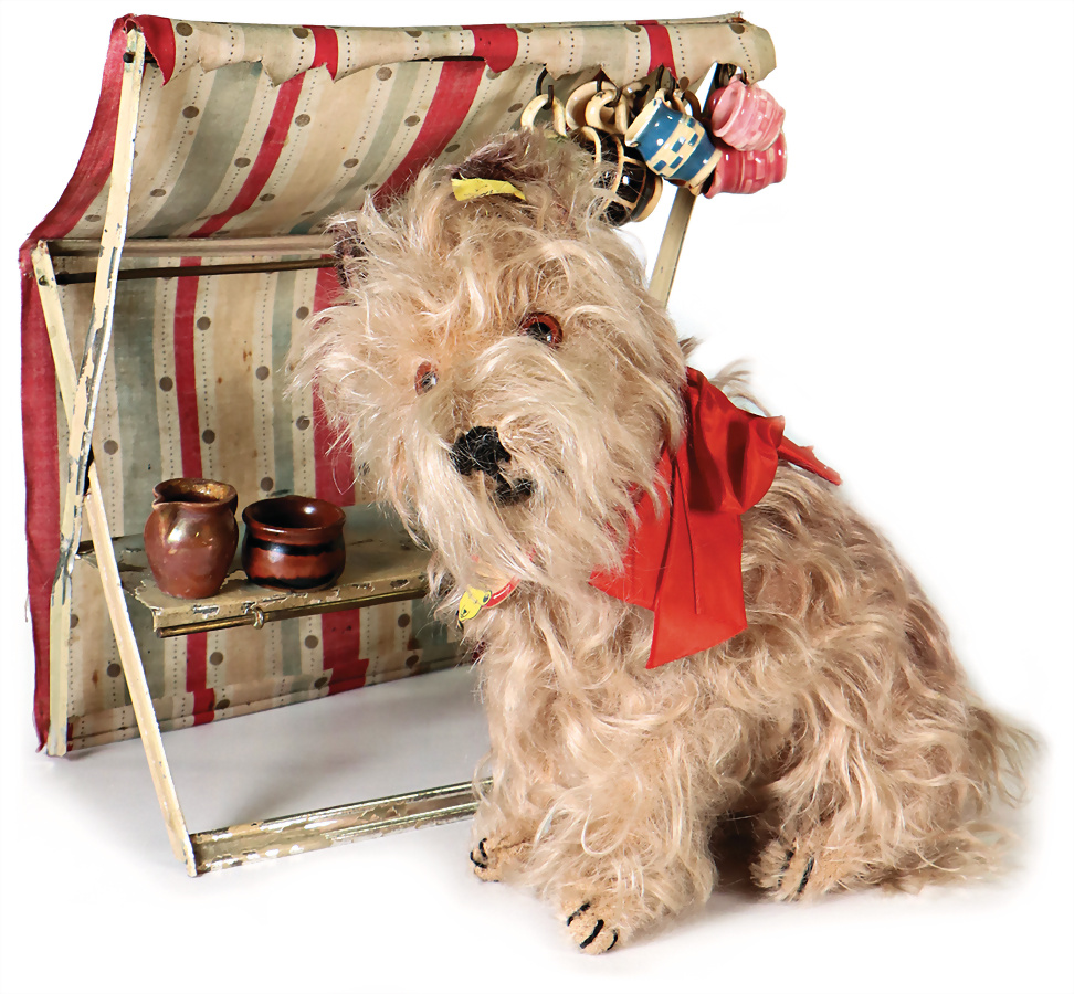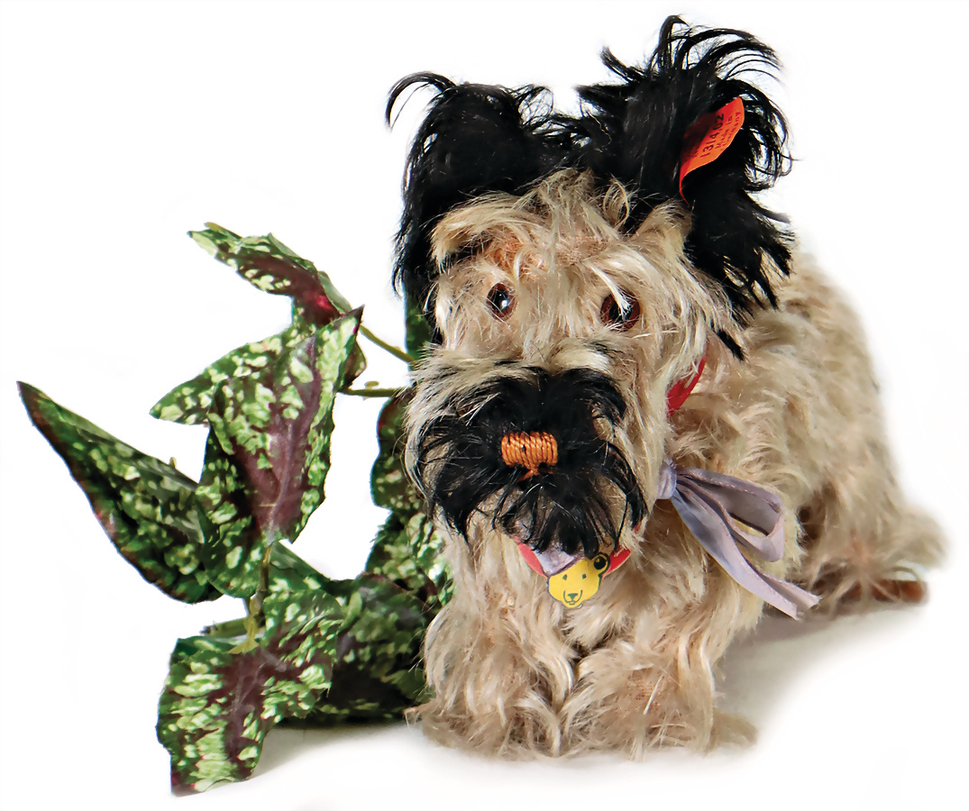 SKYE TERRIER, Artikel-Nr. 1314,02, hergestellt am 17.07.1933, Musterstück, mit Knopf, Druckbuchstaben, langgezogenes f, rote Fahne, Nr. auf Fahne: 1314,02, Brustschild mit roter Aufschrift: Skye Terrier, auf kl. Holz-Röllchen, H: 17 cm, L: 25 cm, unbespielter orig.-Zust., Handmuster aus dem Steiff-Archiv mit orig. Steiff-Archiv Anhänger
