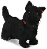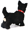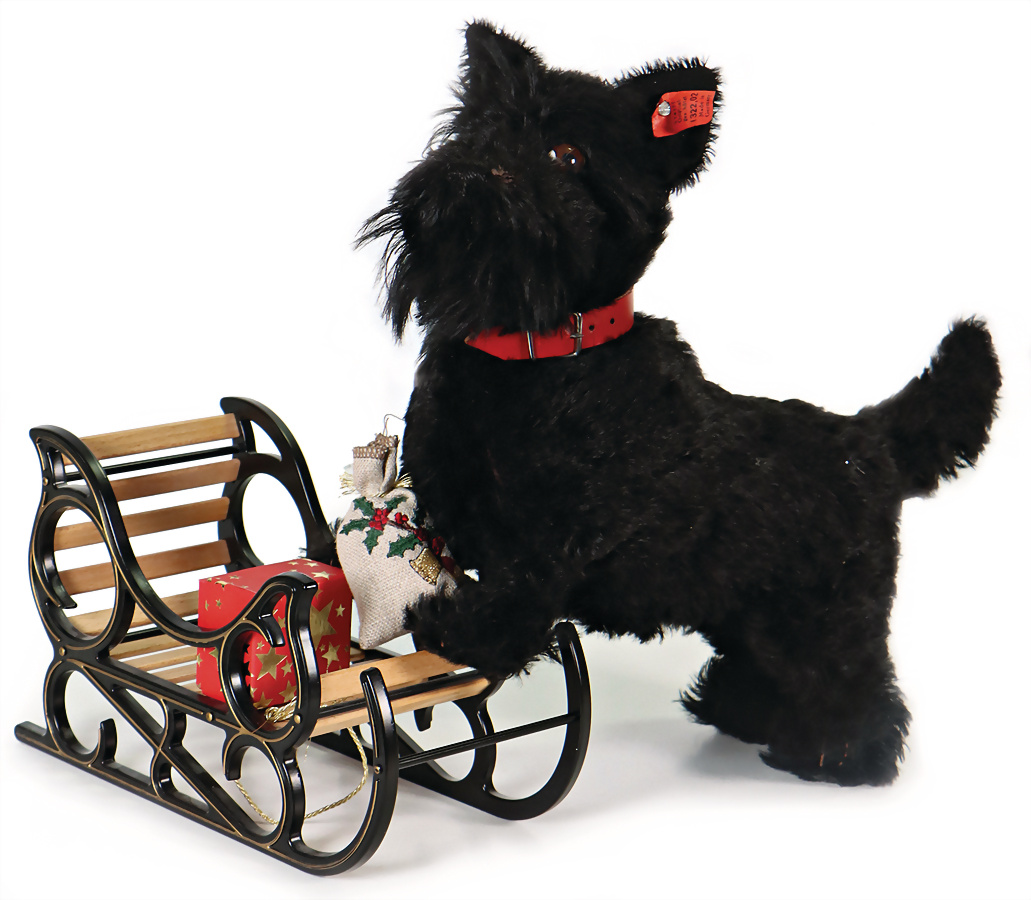 SCOTTY, Artikel-Nr. 1322,02, hergestellt am 29.06.1934, mit Knopf, Druckbuchstaben, langgezogenes f, unbespielte rote Fahne, Nr. auf Fahne: 1322,02, sehr schönes glänzendes schwarzes Mohair, drehbarer Kopf, gr. Glasaugen, rotes Leder-Halsband, minim. Mohair Abrieb auf der linken Seite der Schnauze, sonst unbespielter orig.-Zust., Handmuster aus dem Steiff-Archiv mit orig. Steiff-Archiv Anhänger