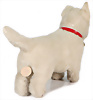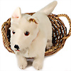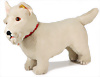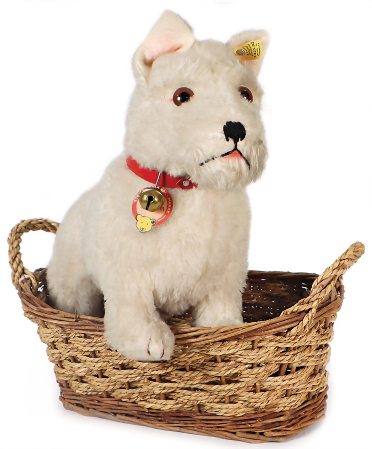SEALYHAM, Artikel-Nr. 1325,02, hergestellt Februar 1940, mit Knopf, Druckbuchstaben, langgezogenes f, unbespielte gelbe Fahne, Aufschrift: Steiff Original geschützt 1325,02 made in Germany, Brustschild mit roter Aufschrift: Sealyham, Leder-Halsband, weißes Lammplüsch, gr. Glasaugen, Filz-Einsatz im Innenohr, H: 24 cm, L: 37 cm, sehr schöner Zust., Handmuster aus dem Steiff-Archiv mit orig. Steiff-Archiv Anhänger