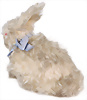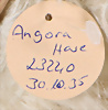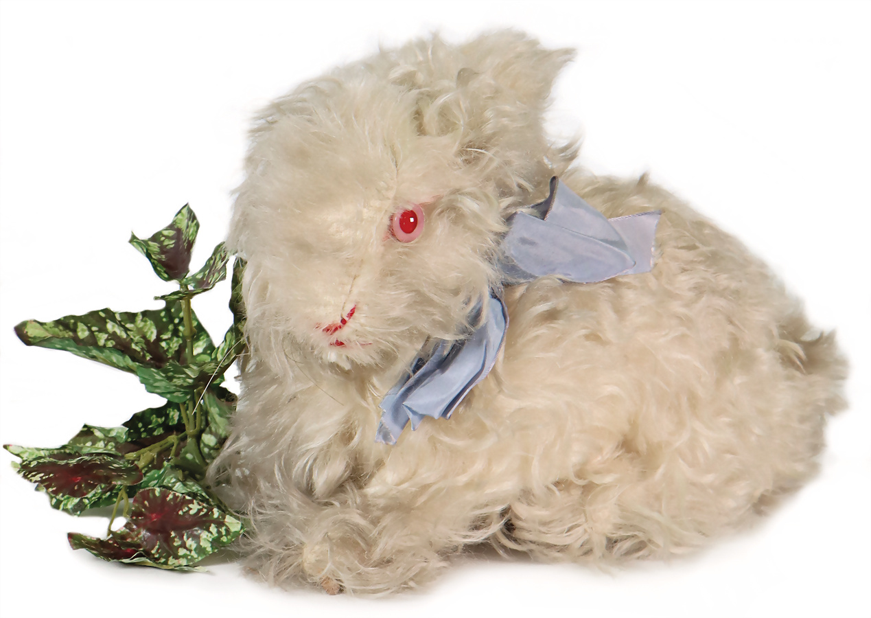 Angora Hase Albino, Artikel-Nr. 2322,0, hergestellt am 30.10.1935, liegend, Musterstück, mit Holz-Rollen an den Füßen, langes weißes Mohair, rosa Glasaugen, rote Nasenbestickung, Filz-Innenohr, H: 26 cm, L: 36 cm, Handmuster aus dem Steiff-Archiv mit orig. Steiff-Archiv Anhänger