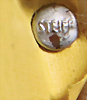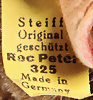RECORD PETER, Artikel-Nr. 325, hergestellt 1936, mit Knopf, Druckbuchstaben, langgezogenes f, unbespielte gelbe Fahne mit Aufschrift: Steiff Original geschützt REC PETER 325 made in Germany, eingesetzte Glasaugen, Filz-Gesicht, -Ohren, -Hände und -Füße, sehr schönes deutl. Airbrush, auf Holz-Exzenter-Rädern, H: 26 cm, L: 23 cm, unbespielter orig.-Zust., Handmuster aus dem Steiff-Archiv mit orig. Steiff-Archiv Anhänger