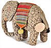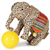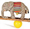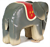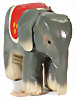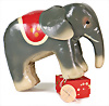Spiel-Elefant, Artikel-Nr. 1514,02, hergestellt 1934, mit Knopf, Druckbuchstaben, langgezogenes f, minim. Reste der roten Fahne, unterlegte Schuhknopfaugen, Krimmer Stoff grau stehend, mit bunter Schabracke, kl. Nomotta-Bommel, H: 13 cm, L: 20 cm, Filz-Schwanz, außergewöhnlich, selten, Handmuster aus dem Steiff-Archiv mit orig. Steiff-Archiv Anhänger