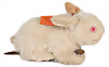 Hase Albino, Artikel-Nr. 2307, hergestellt 1928, mit Knopf, Druckbuchstaben, langgezogenes f, sowie roter Fahne, Nr. auf Fahne: 2307, rosane Glasaugen, weißes Mohair etwas licht, liegend, Seidenschleife etwas verschlissen, Samt-Innenohr, H: 8 cm, L: 14 cm, Handmuster aus dem Steiff-Archiv mit orig. Steiff-Archiv Anhänger