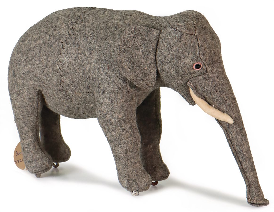 Elefant, Artikel-Nr. 1117, hergestellt 1914, Musterstück, hergestellt ohne Gussspeichenrädern, Filz, Schuhknopfaugen, unbespielter orig.-Zust., H: 17 cm, L: 23 cm, Handmuster aus dem Steiff-Archiv mit orig. Steiff-Archiv Anhänger