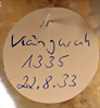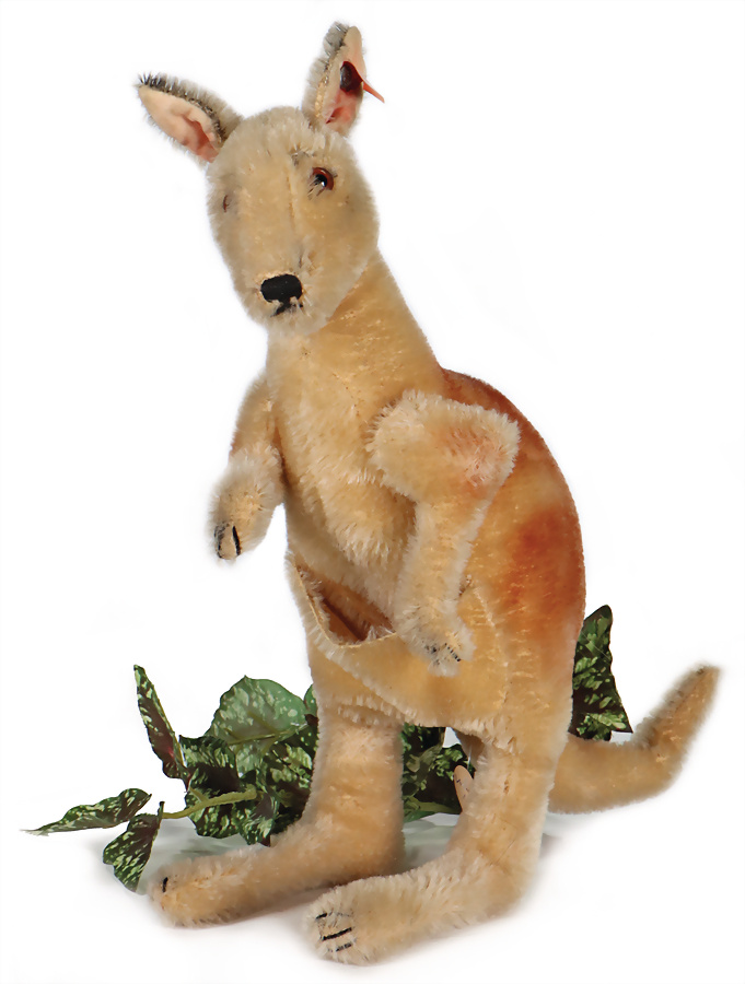 Känguru, Artikel-Nr. 1335, hergestellt am 22.08.1933, mit Knopf, Druckbuchstaben, langgezogenes f, sehr schön erhaltene rote Fahne, Aufschrift: Steiff Original geschützt 1335 made in Germany, drehbarer Kopf und Beine, Samteinsatz im Innenohr, schönes rostbraunes und beiges Mohair, Glasaugen, ohne Baby, 35 cm, selten, Handmuster aus dem Steiff-Archiv mit orig. Steiff-Archiv Anhänger