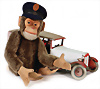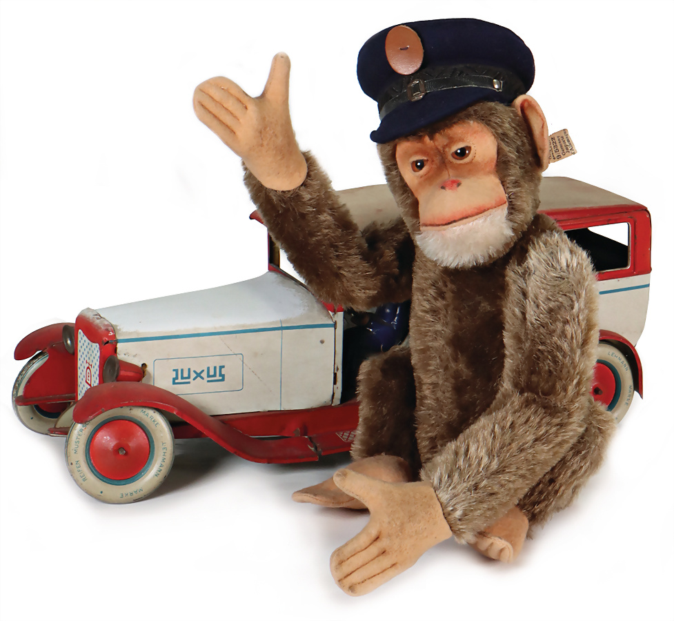 ...mit Begeisterung blickten die technikversessenen Steiff-Brüdern zur aufkommende Motorisierung und waren bald stolze Besitzer des ersten Kraftfahrzeuges in Giengen. Um den Autos einen persönlichen Touch verleihen zu können, kreierte das Genie Paul Steiff eine Reihe von Autokühler Figuren wie Clown, Golliwog, Jäger, Bauer und Bäuerin, die Zwerge Snik und Snak, Postillon, Max und Moritz, Münchner Kindl und viele andere. Ebenso geht dann der Autoschimpanse 1912/1913 in Produktion - hier in einem umwerfenden Zustand!