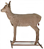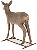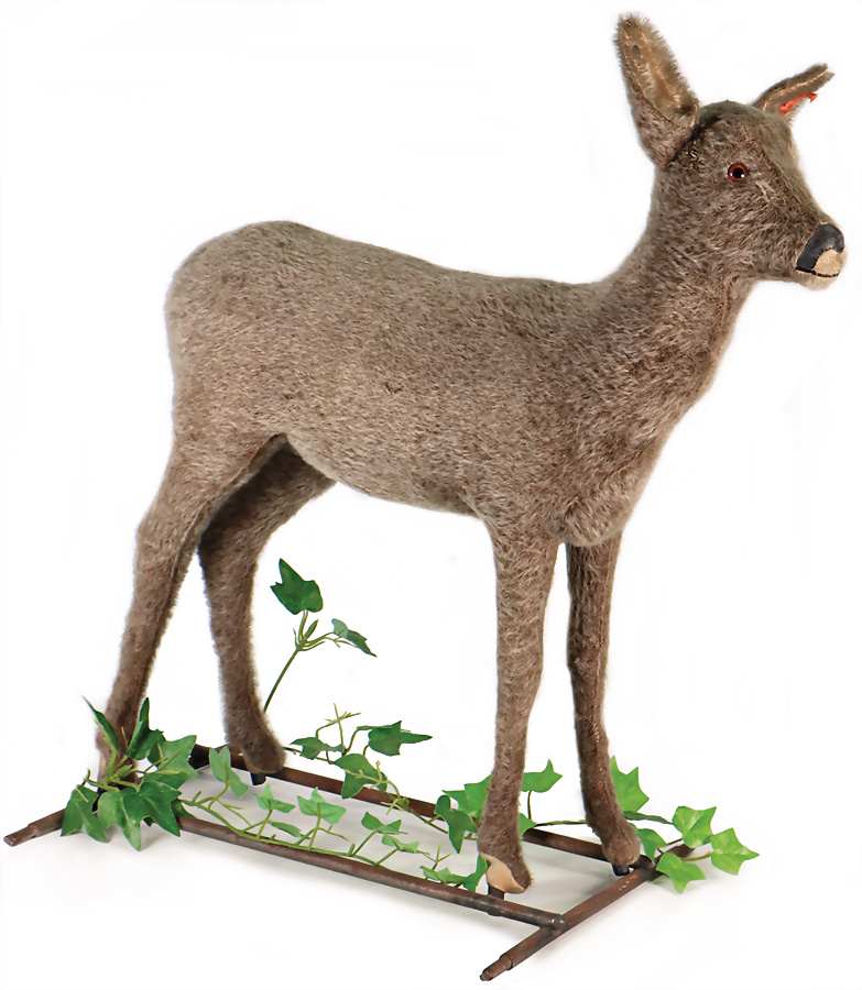 Reh, Artikel-Nr. 1250, hergestellt 1926, Musterstück mit Muster-Knopf, sowie Steiff-Knopf, Druckbuchstaben, langgezogenes f, rote Fahne, handschriftlich: 1250, Glasaugen, lederne eingesetzte Nase, auf Gussspeichen-Vorrichtung, ohne Räder, H: 58 cm, L: 57 cm, sehr schöner unbespielter Zust., Handmuster aus dem Steiff-Archiv mit orig. Steiff-Archiv Anhänger