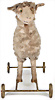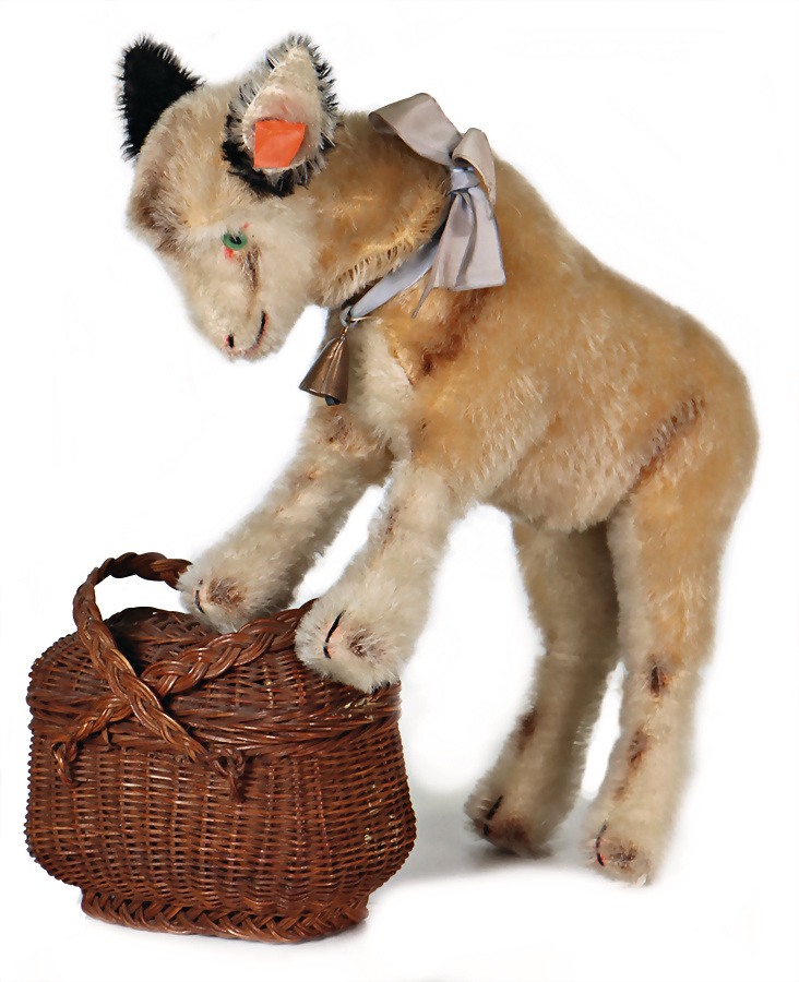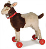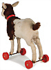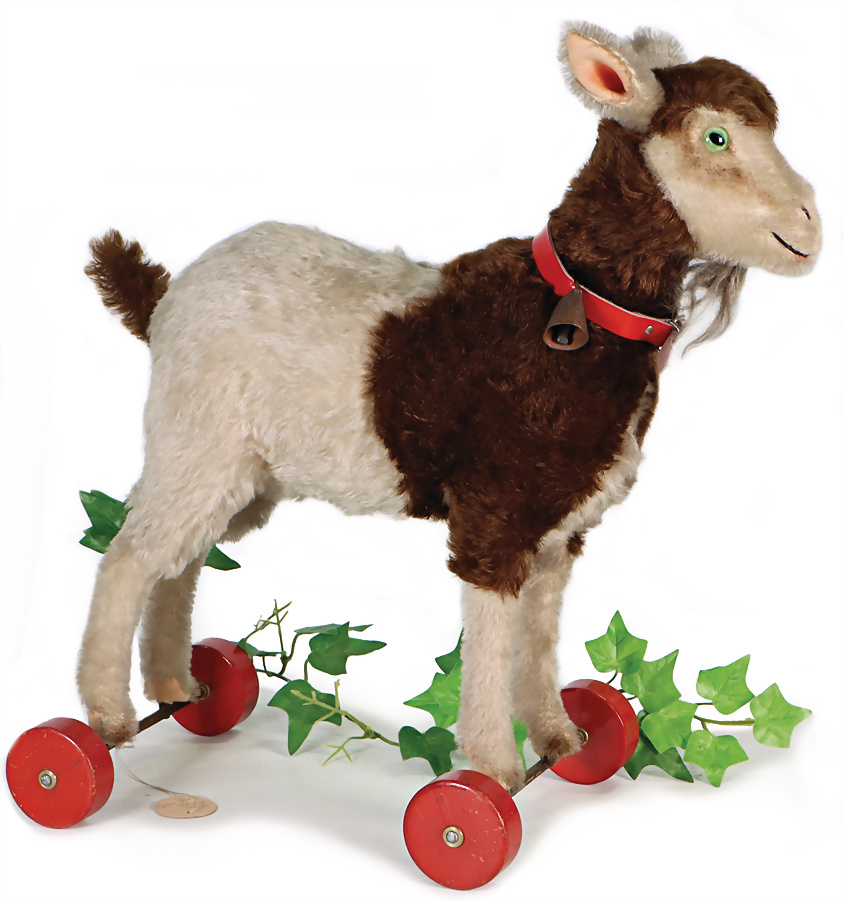 Ziege, Rollentier, Artikel-Nr. 1335, hergestellt August 1935, grüne Glasaugen, braun/beiges schönes volles Mohair, auf roten Holz-Rollen, Halsband mit Glocke, H: 38 cm, L: 39 cm, schöner unberührter orig.-Zust., Handmuster aus dem Steiff-Archiv mit orig. Steiff-Archiv Anhänger