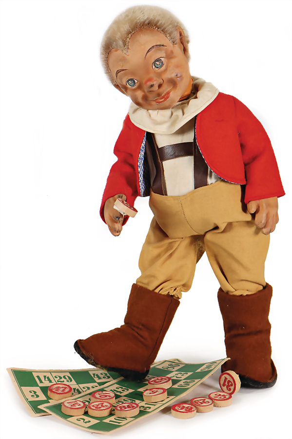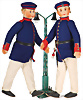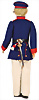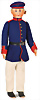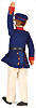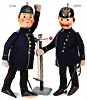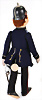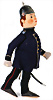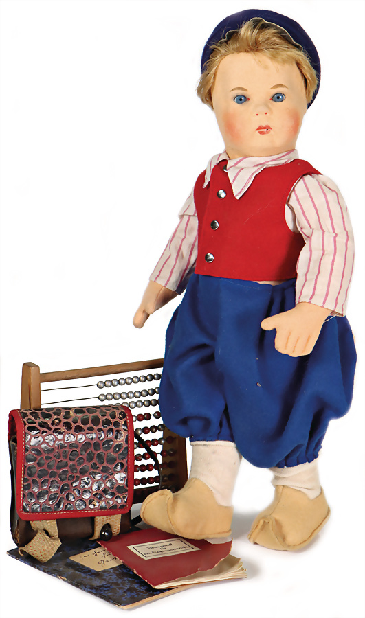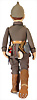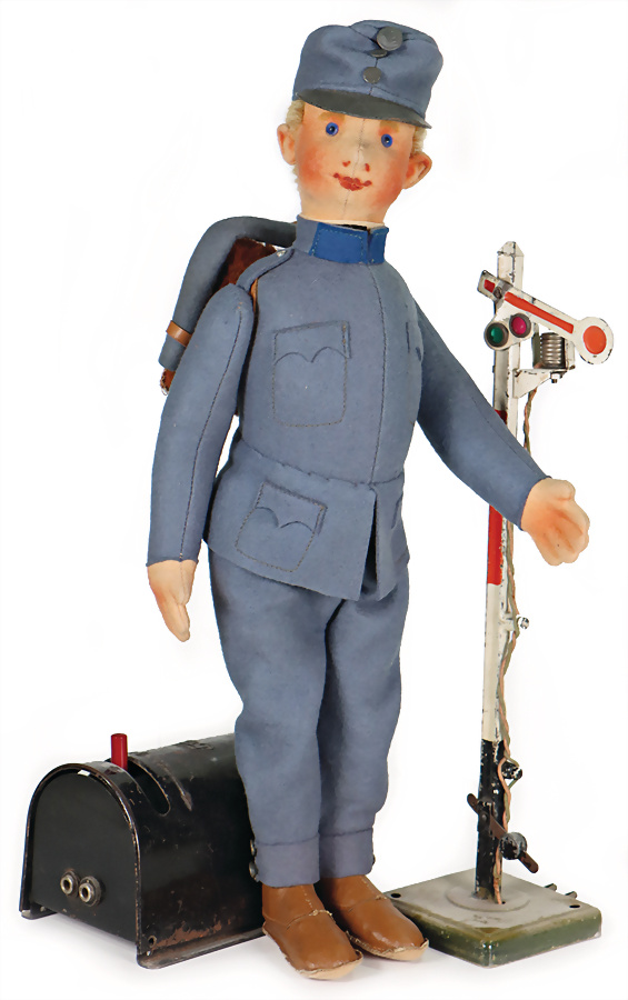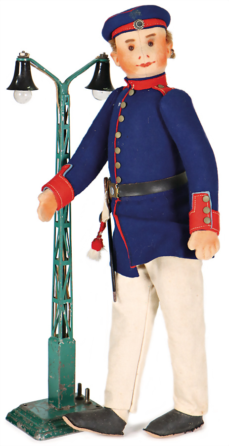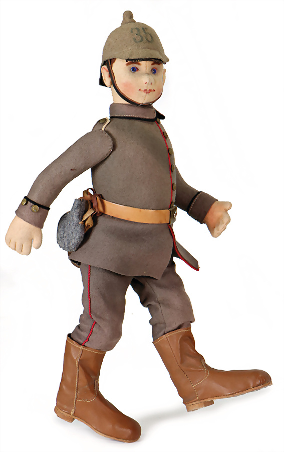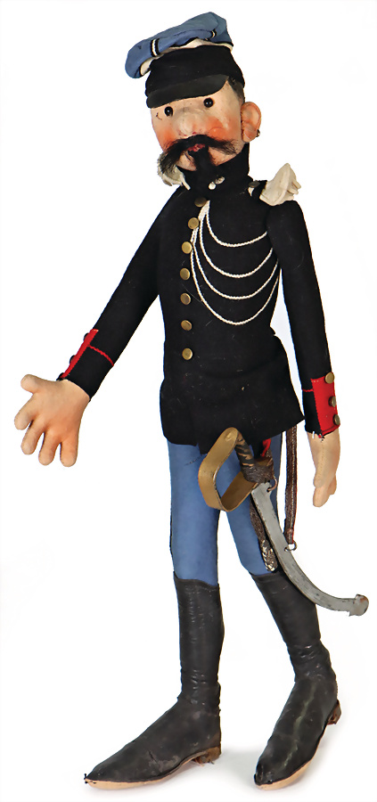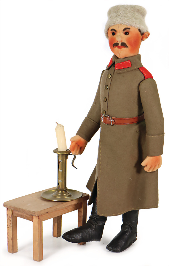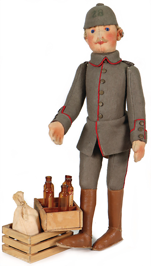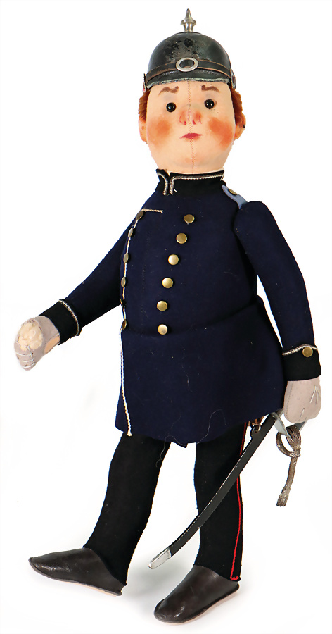 Die letzten Jahre vor dem ersten Weltkrieg sind geprägt von einer Militarisierung der Gesellschaft. Besonders in den Kinderzimmern halten Puppen von Uniformträgern Einzug. Vom einfachen Soldaten bis hin zu uniformierten Puppen, wie dieser Gendarm, bringt die Firma Steiff eine ganze Palette an Uniformfiguren auf den Markt. Der Gendarm ist ein Beispiel für die liebevolle und umfassende Ausstattung mancher Puppen. Er ist mit seinem eingesetzten Schnurrbart und Accessoires ein ganz besonderes Stück Uniformkult und Zeitgeschichte.