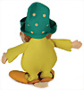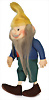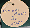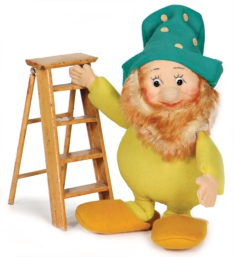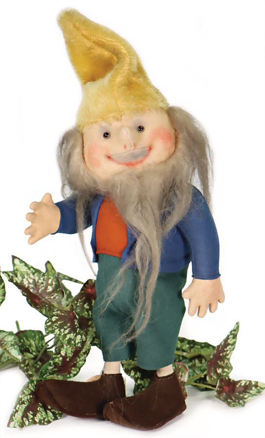 Gnom Puck, hergestellt 1914, Artikel-Nr. 30, mit Knopf, Druckbuchstaben, langgezogenes f, kl. Reste der weißen Fahne, Filzkopf, sehr schönes, deutliches Airbrush, gelbe Mohair-Mütze, lange Haare, bewegliche Arme u. Beine, unbespielte Filzkleidung, Höhe mit Mütze 38 cm, ausdrucksstark, Handmuster aus dem STEIFF Archiv, mit original STEIFF Archiv-Plakette
