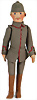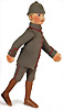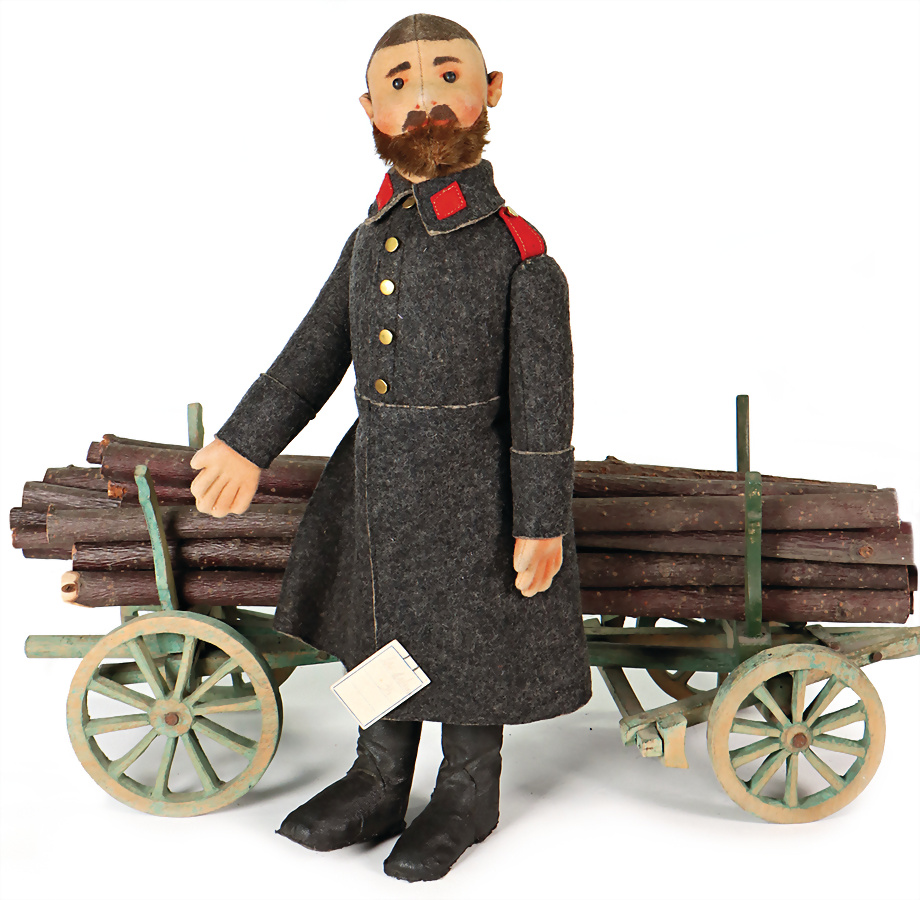Landsturm-Mann, Artikel-Nr. 35, hergestellt 1915, seltene Filz-Figur, braune gemalte Haare, Schuhknopfaugen, einges. Vollbart, langer, grauer Filz-Mantel, mit goldener Knopfreihe, hohe Leder-Stiefel, zusätzl. angebrachtes Orig.-Papierschild Musterstück aus dem STEIFF Archiv, 37 cm, sehr schöner, unbespielter Zust.