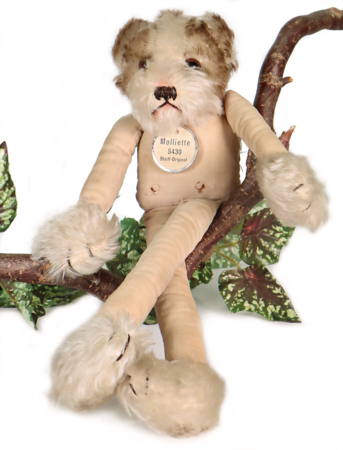 Molliette, mit Knopf, Artikel-Nr. 5430, hergestellt 1927, mit Knopf, Druckbuchstaben, langgezogenes f, rote, sehr gut erhaltene Fahne, mit handschriftlicher Nr. 5430, geflammtes Mohair, Glasaugen, Brustschild mit Metallring, Molliette 5430 STEIFF Original, lange Gliedmaßen, Samt altersbedingt etw. eingestaubt, 31 cm