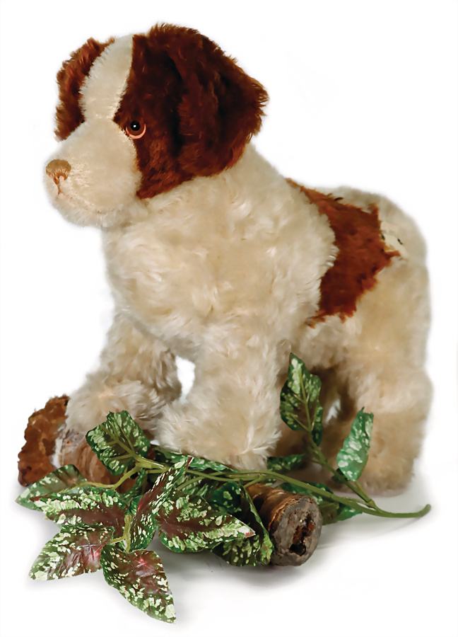 Bernhardiner, hergestellt 1914, Artikel-Nr. 6328,01, junger stehender Bernhardiner, mit beige/braun geflecktem Mohair,. Filzinnenseiten des Ohres, 1 Glasauge gerissen, Filz unterlegte Glasaugen, mit Orig.-Papieretikett, mit Federschrift, Berna. 6328, 01 M. Nr. 7/50, 1 Ecke des Papierschildes fehlt, Stehhöhe 28 cm, L: 37 cm, sonst sehr schöner unbespielter Zustand, ausdrucksstark, Handmuster aus dem STEIFF Archiv, mit original STEIFF Archiv-Plakette