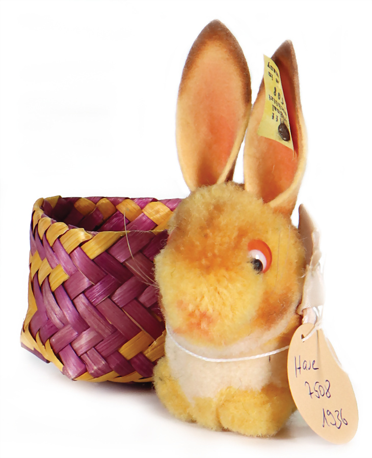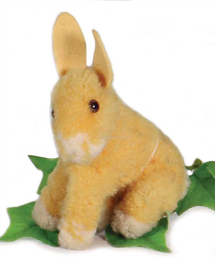 Wollminiatur, Hase, Artikel-Nr. 3507, hergestellt 1935, Glasaugen, Filzohren, Biegekopf, Sitzhöhe 9 cm, unbespielter Zustand