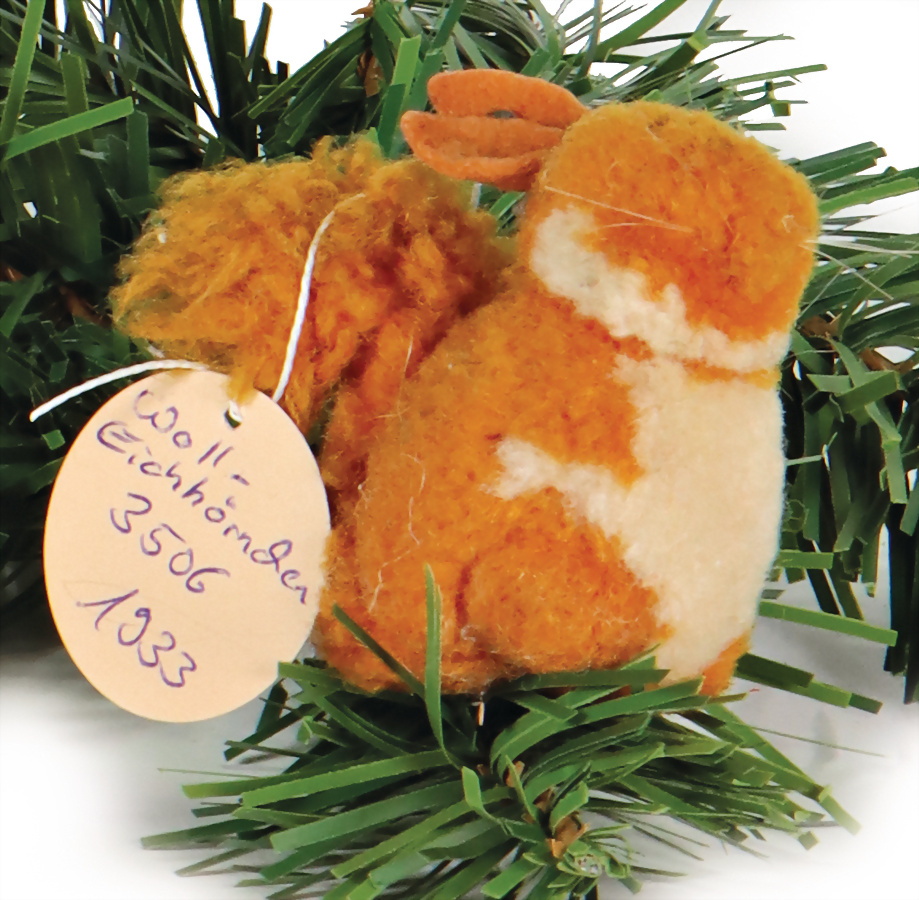 Wollminiatur, Eichhörnchen, Artikel-Nr. 3506, hergestellt 1933, kleiner STEIFF Knopf, sowie kleine Schuhknopfaugen, Filzohren, buschiger Wollschwanz, drehbarer Kopf, 5,5 cm, guter Zustand