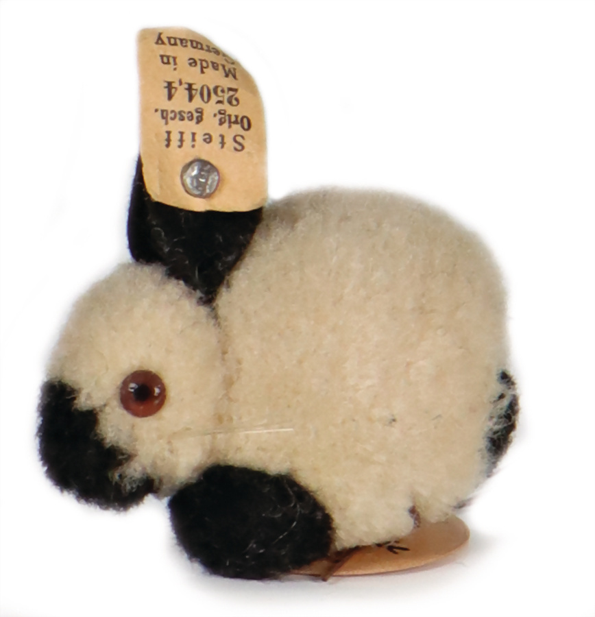 Wollminiatur, Hase, Artikel-Nr. 2504,4, hergestellt 1932, schwarzweiße Wolle, sehr gut erhaltene, weiße Fahne, Aufschrift STEIFF original geschützt 2504,4, Made in Germany, sehr schöner, unbespielter Zustand