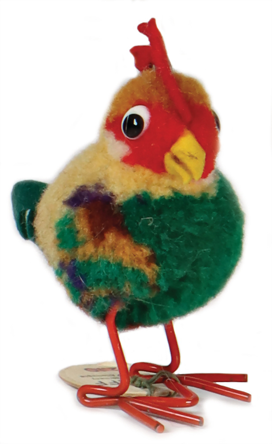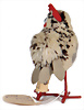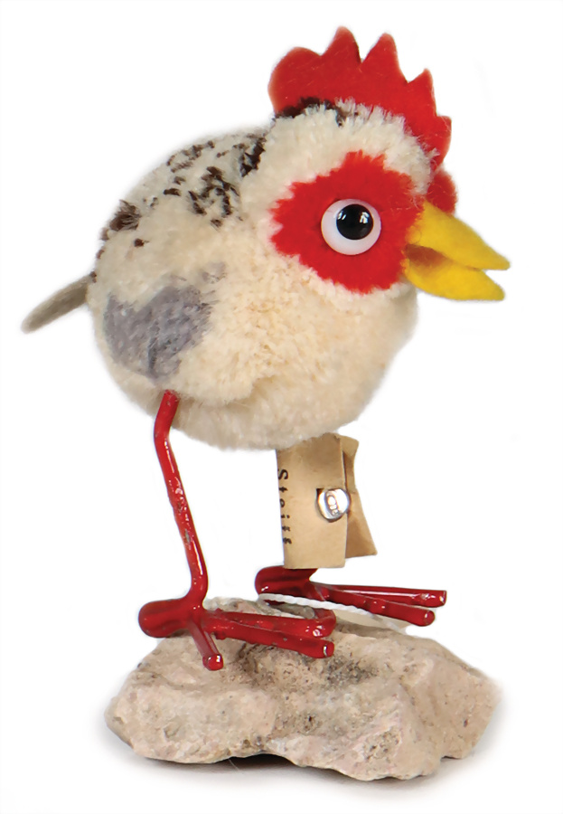 Wollminiatur, Henne, Artikel-Nr. 1508, Filzknopf, weiße Fahne, Aufschrift STEIFF orig. 1508 Made in Germany, hergestellt 1938, weißbraunes Gefieder, roter Filzkamm, sowie Schnabel und Schwanz, Metallbeine, große weiße Augen mit schwarzer Pupille, stehend, 6,5 cm, sehr schöner, unbespielter Zustand
