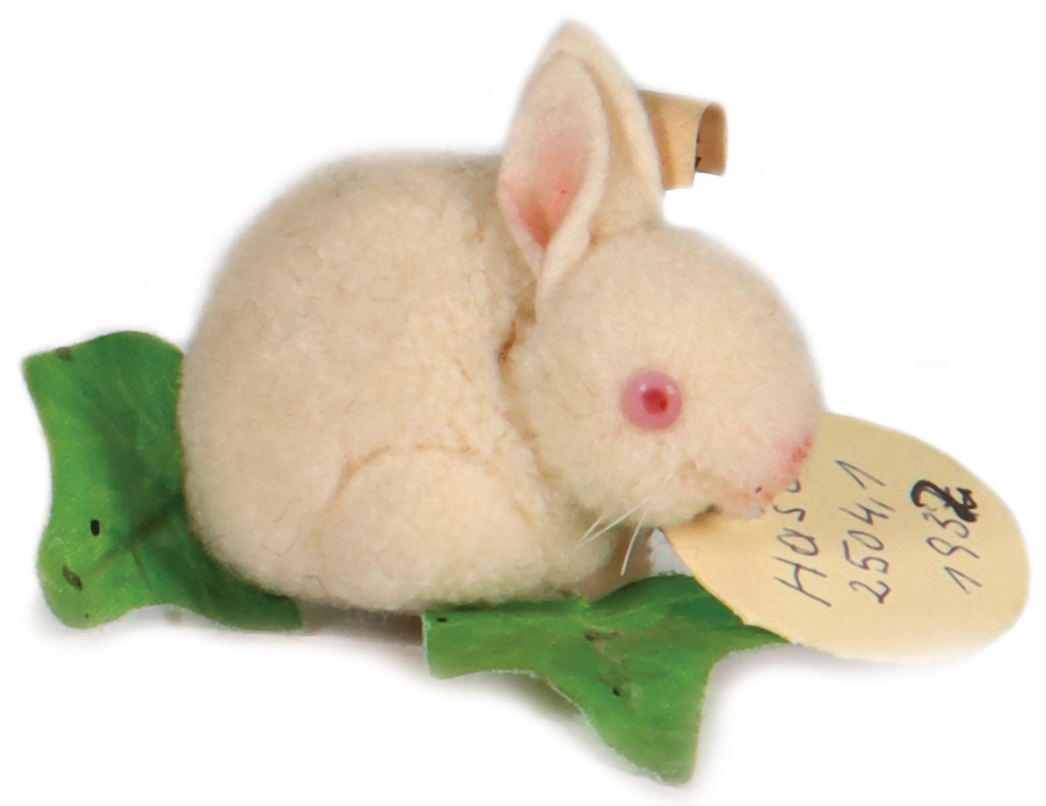 Wollminiatur, Albinohase, Artikel-Nr. 2504,1, hergestellt 1932, große, rote Glasaugen, Filzohren, mit Knopf, unbespielte Papierfahne, Aufschrift STEIFF orig. gesch., Artikel-Nr. 2504,1, Made in Germany, 4 cm