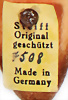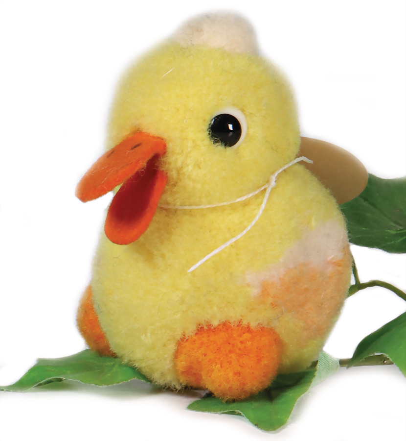 Wollente, Artikel-Nr. 3508, hergestellt 1936, mit kleinem, angelaufenem STEIFF Knopf, unbespielte gelbe Fahne, Aufschrift STEIFF original geschützt, handschriftlich 3508 Made in Germany, Filzschnabel, drehbarer Kopf, große, weiße Augen mit schwarzer Pupille, schöner unbespielter Zustand, 7 cm