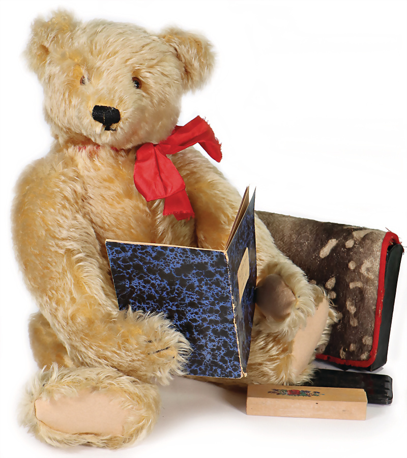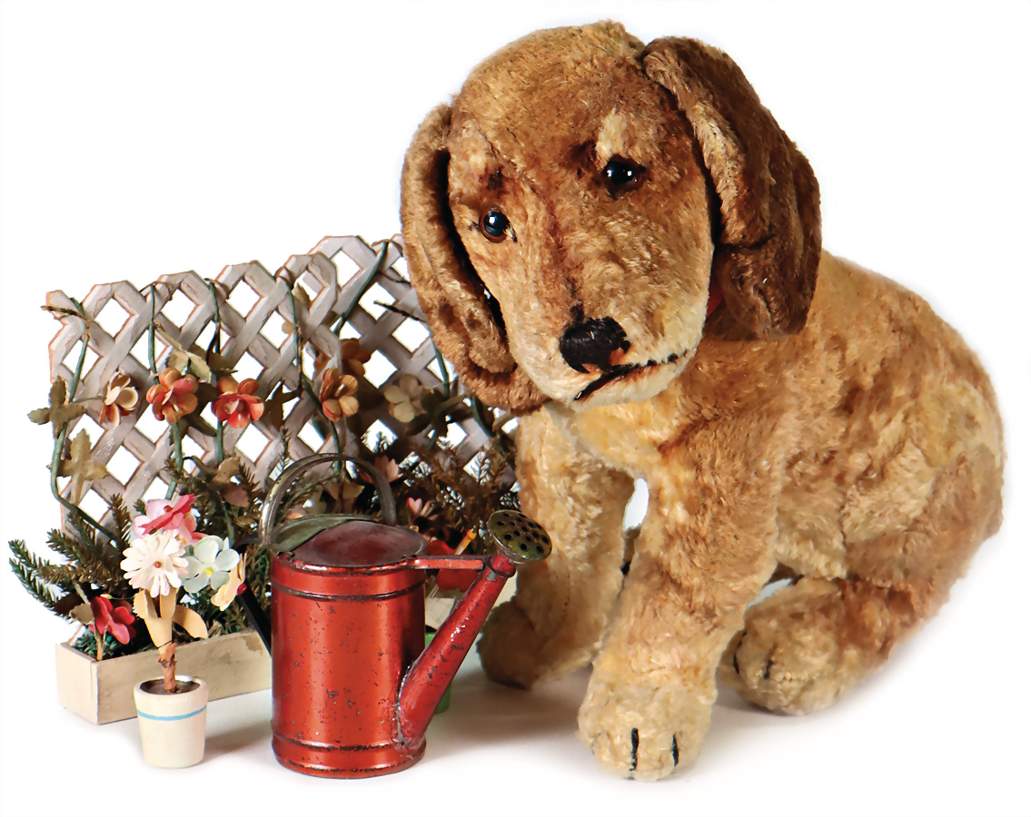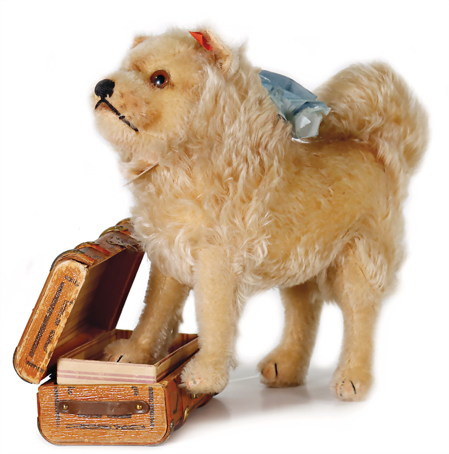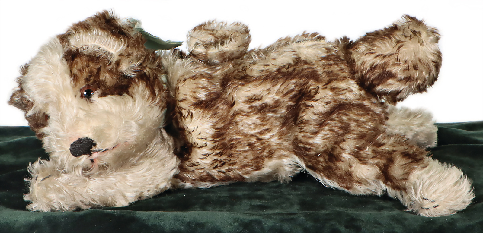 Der Molly Hund von Steiff war der Verkaufsschlager ab 1925 und wurde sogar bis in die 1950er Jahre hergestellt. Diesen süßen Hund mit seinem auffällig geflammten Mohair gab es nicht nur in verschiedenen Farben und Größen sitzend oder stehend, sondern auch in verschiedenen Varianten, wie als Nadelkissen, mit Musikspielwerk, als Kasperlfigur, als Molliette und wie in unserem schönen Beispiel als Tasche. Hier konnte man im Lieblingsspieltier noch einen kleinen Schatz verstecken.