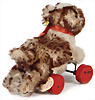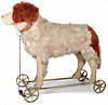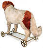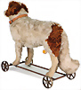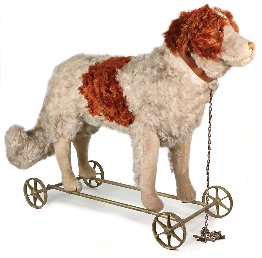 Rollentier, Bernhardiner, Artikel-Nr. 1360, 2, hergestellt 1914, mit STEIFF Knopf, Druckbuchstaben, langgezogenes f, sowie mit 2 Musterknöpfen versehen, Glasaugen, Lederhalsband, Kettenhundeleine, auf Gussspeichenrädern, schönes, rostrotes Mohair, Zugstimme, intakt, H: 63 cm, L: 70 cm, etwas eingestaubt, sonst schöner Zustand, beeindruckende Größe, Musterstück aus dem STEIFF Archiv