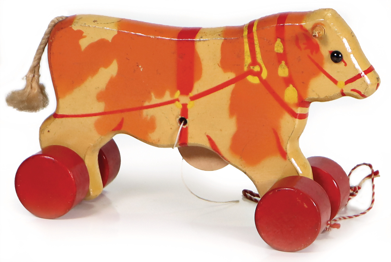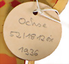 Ochse auf Exzenter-Rädern, Archiv-Anhänger Nr. 52/1812EX, 1936, sehr guter unbespielter Zustand, Handmuster aus dem STEIFF Archiv