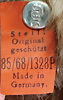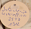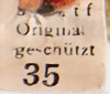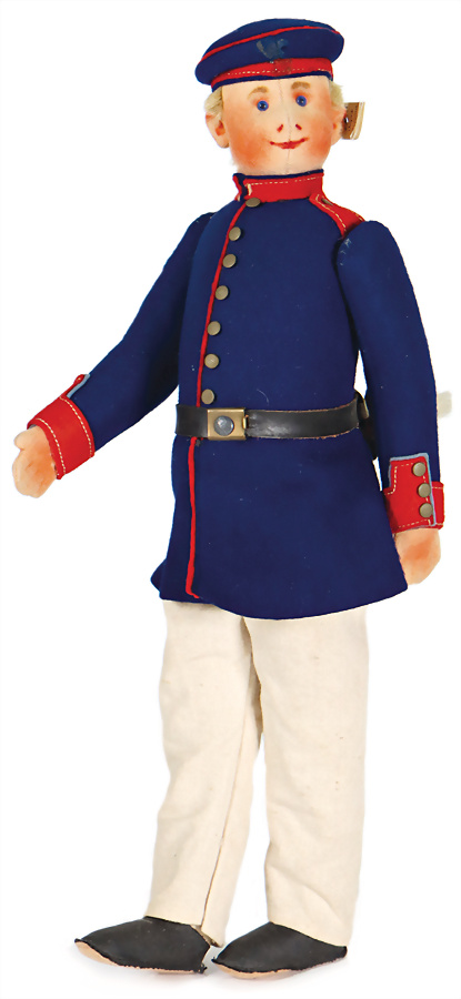 Filz-Puppe, Infanterist, Unteroffizier, hergestellt 1912, Artikel-Nr. 35TD, Filzpuppe mit Filzkopf, kl. braune Glasaugen, mit deutliches Airbrush, mit Knopf, Druckbuchstaben, langgezogenes f, weiße Fahne, Aufschrift STEIFF Original geschützt 35, eingesetzte Mohair-Haare, Filz-Kappe mit Gürtel, Säbel u. Quaste, Filz-Jacket, mit abgesetztem roten Filzkragen, goldene Knöpfe, Leinenhose, an vereinzelten Stellen etwas fleckig, sonst guter Zustand, Handmuster aus dem Steiff-Archiv mit orig. Steiff-Archiv Anhänger
