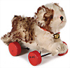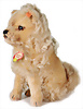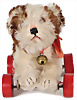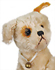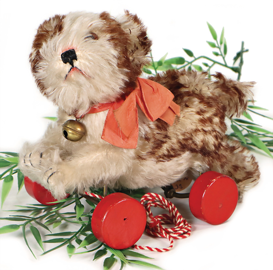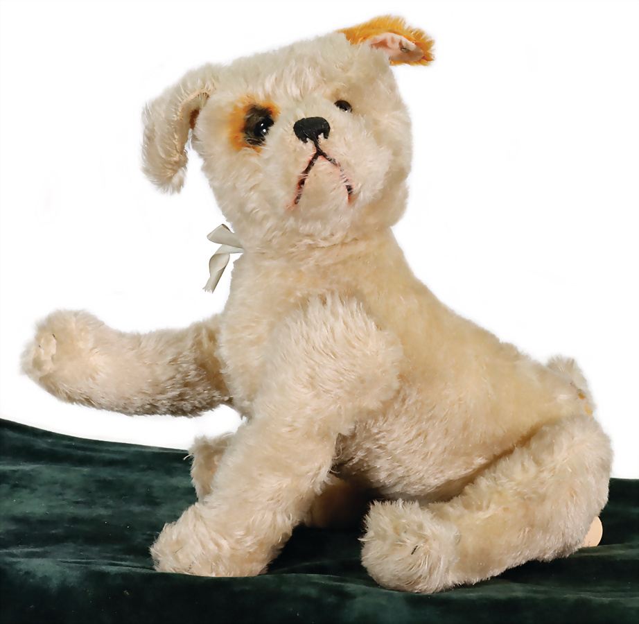Bell-Hund MOLLY, Artikel-Nr. 1314, 2 EX, hergestellt 1939, mit Knopf, Druckbuchstaben, langgezogenes f, sowie gelbe unbespielte Fahne, Aufschrift: Steiff Original geschützt made in Germany, ohne Fahnen-Nummer, kl. Molly, rennend, auf Holz-Exzenter-Rädern, drehbarer Kopf, gespitztes Mohair, H: 27 cm, L: 20 cm, sehr schöner unbespielter Zust., Handmuster aus dem Steiff-Archiv mit orig. Steiff-Archiv Anhänger