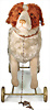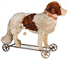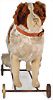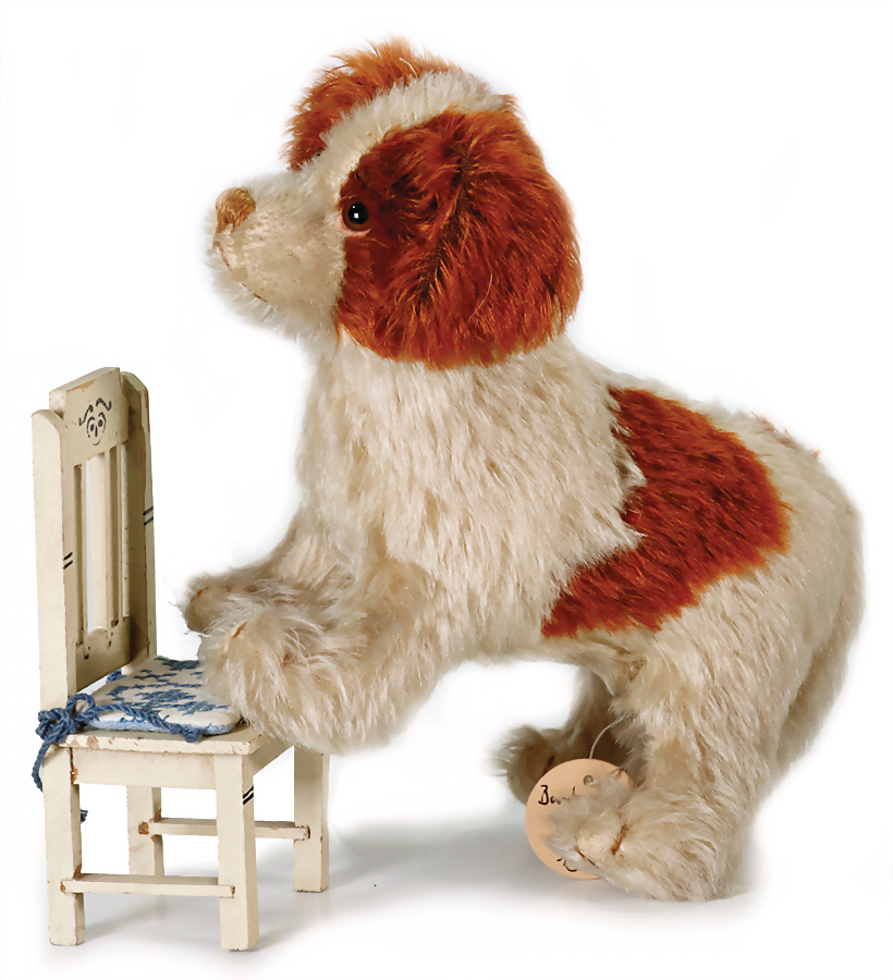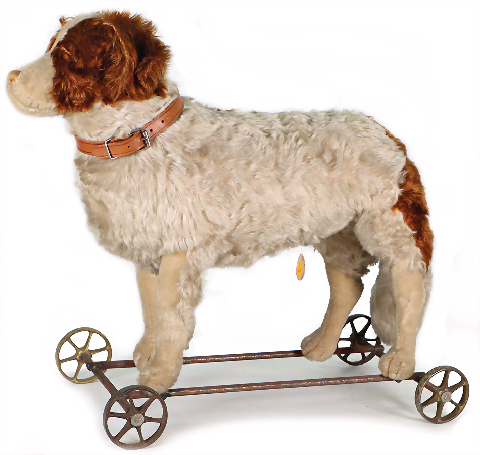 Handmuster aus dem STEIFF Archiv, Bernhardiener, hergestellt 1914, Artikel-Nr. 1343, 2, mit Knopf, Druckbuchstaben, langgezogenes f, Reste der weißen Fahne, sowie mit 2 Musterknöpfen, gr. Glasaugen, rostbraun/beige Mohair, mit ledernem Halsband mit STEIFF Prägung, auf Gussspeichenrädern, mit funktionstüchtiger Zugstimme, H: 42 cm, L: 50 cm, etwas eingestaubt, sonst sehr schöner Orig.-Zustand, selten