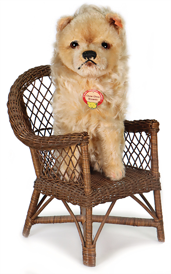 Hund CHOW-CHOW BROWNIE, Artikel-Nr. 3328, 2, hergestellt 19287, mit Knopf, rote Fahne, etwas ausgeblichen, Nr. auf Fahne: 3328, 2, mit Brustschild, rote Aufschrift: Chow-Chow Brownie gr. eingesetzte traurig blickende Glasaugen, sitzend, Langmohair, 28 cm, Seidenschleife altersbed. etwas verschlissen, ausdrucksstark, sehr schöner Zust., Handmuster aus dem Steiff-Archiv mit orig. Steiff-Archiv Anhänger