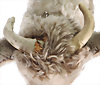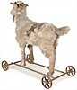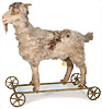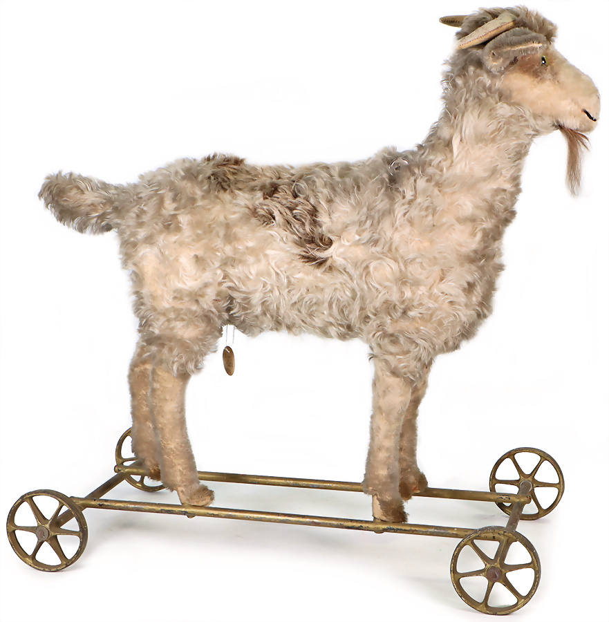 Handmuster aus dem STEIFF Archiv, Ziege, hergestellt 1914, Artikel-Nr. 1350, 2, versehen mit 2 STEIFF Knöpfen, hellgrüne Glasaugen, lederne Hörner, 1 Horn beschädigt, auf Gussspeichenrädern, H: 58 cm, L: 56 cm, mit funktionstüchtiger Zugstimme, langes Ziegenbärtchen, braun/beige gelocktes Mohair