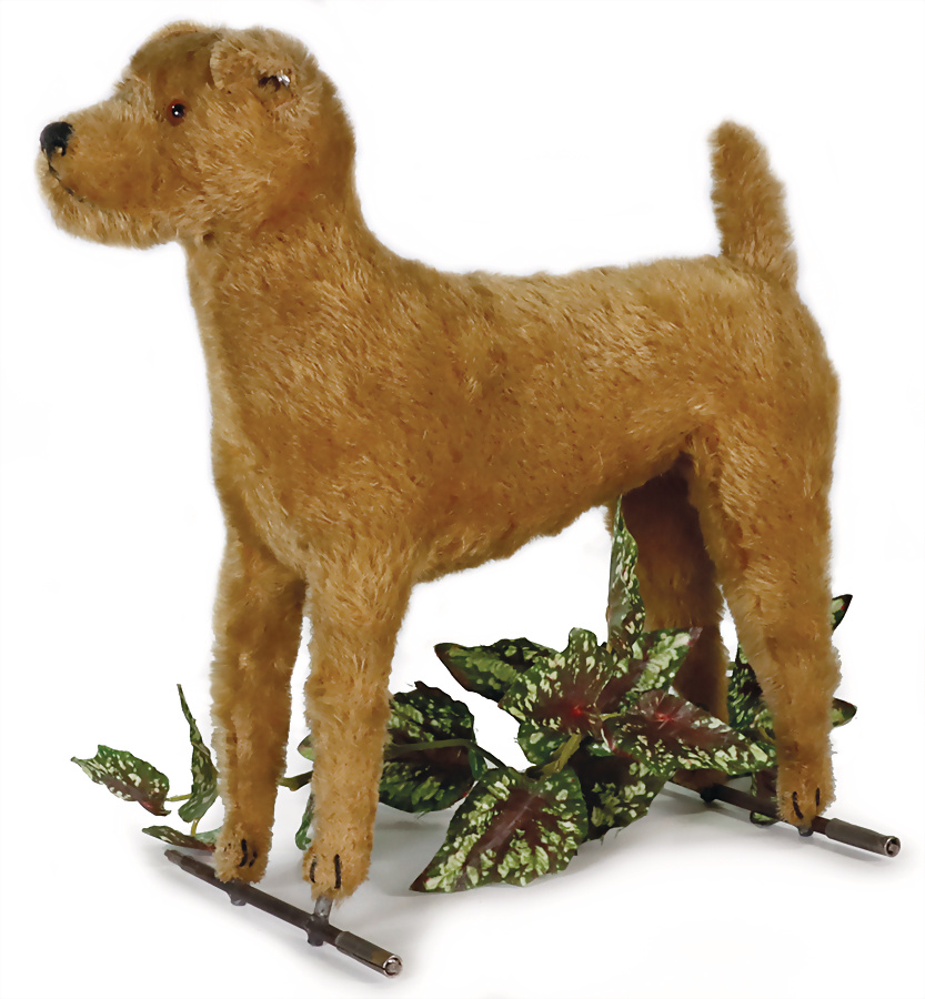 Irish Terrier, hergestellt 1912, Artikelnummer: 1328, braunes kurz Mohair, mit Muster Knopf, H: 28 cm, L: 28 cm, Handmuster aus dem Steiff-Archiv, produziert ohne Gussspeichenräder, Knopf, Schild und Fahne, mit orig. Steiff-Archiv Anhänger, schöner unbespielter Zustand