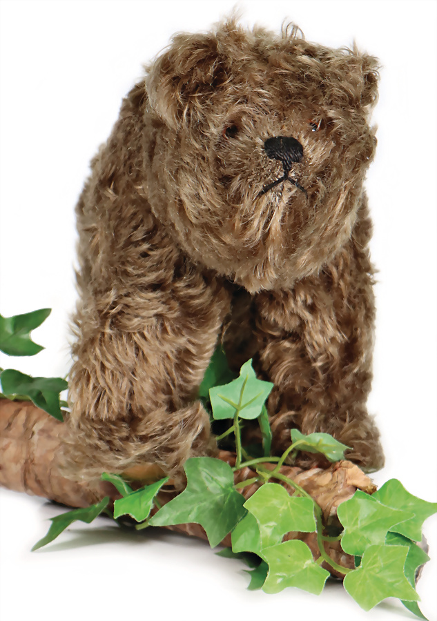 Zottelbär, hergestellt 1914, Artikel-Nr. 1328, 01, Langmohair, Glasaugen, auf 4 Beinen, Filztatzen dunkler getönt, minimale Fehlerstelle an der linken, hinteren Tatze, H: 20 cm, L: 33 cm, unbespielter Orig.-Zustand, Handmuster aus dem STEIFF Archiv, mit original STEIFF Archiv-Plakette
