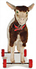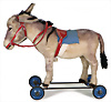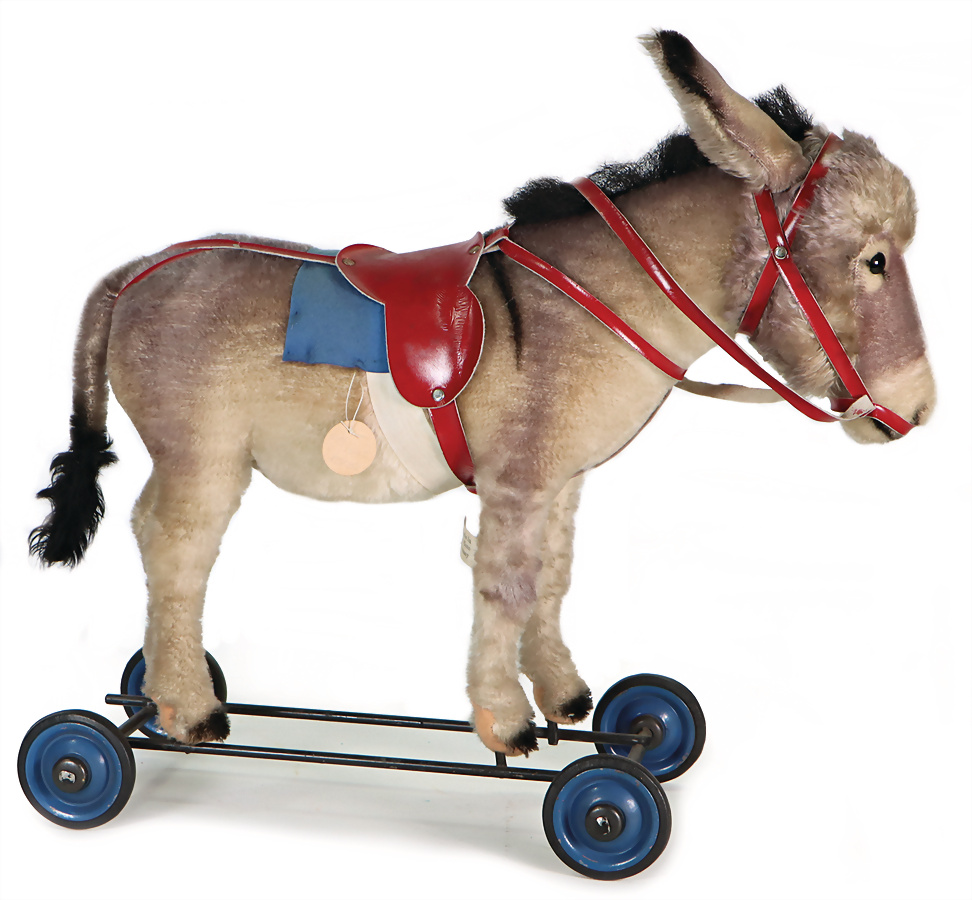 Esel, hergestellt 1951-1952, Artikelnummer: 13442, hergestellt mit US-Zonen Fahne, ohne Knopf, Schild und Fahne, auf gummibereiften Metallrädern, H: 42 cm, L: 42 cm, sehr schöner unbespielter Zustand, mit orig. Steiff-Archiv Anhänger